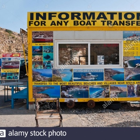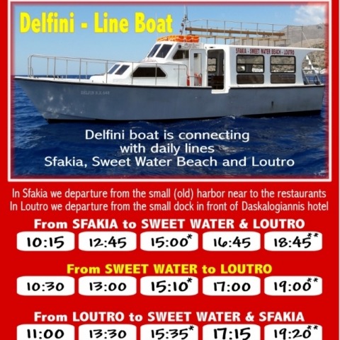 Θαλάσσιες μεταφορές και εκδρομές. Υπάρχουν καθημερινά δρομολόγια από και προς Σφακιά, Λουτρό, Αγία Ρούμελη, Φοίνικα, Μαρμαρά και Γλυκά Νερά. Μπορούμε επίσης να εξυπηρετήσουμε κόσμο και μετά το κλείσιμο της γραμμής.